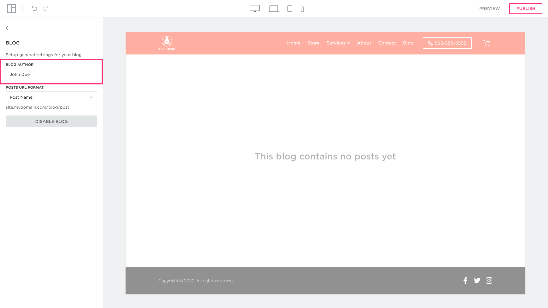 You can set the Blog Author’s name. It will appear in the metadata in the published blog posts.This field is set as the default for all posts.