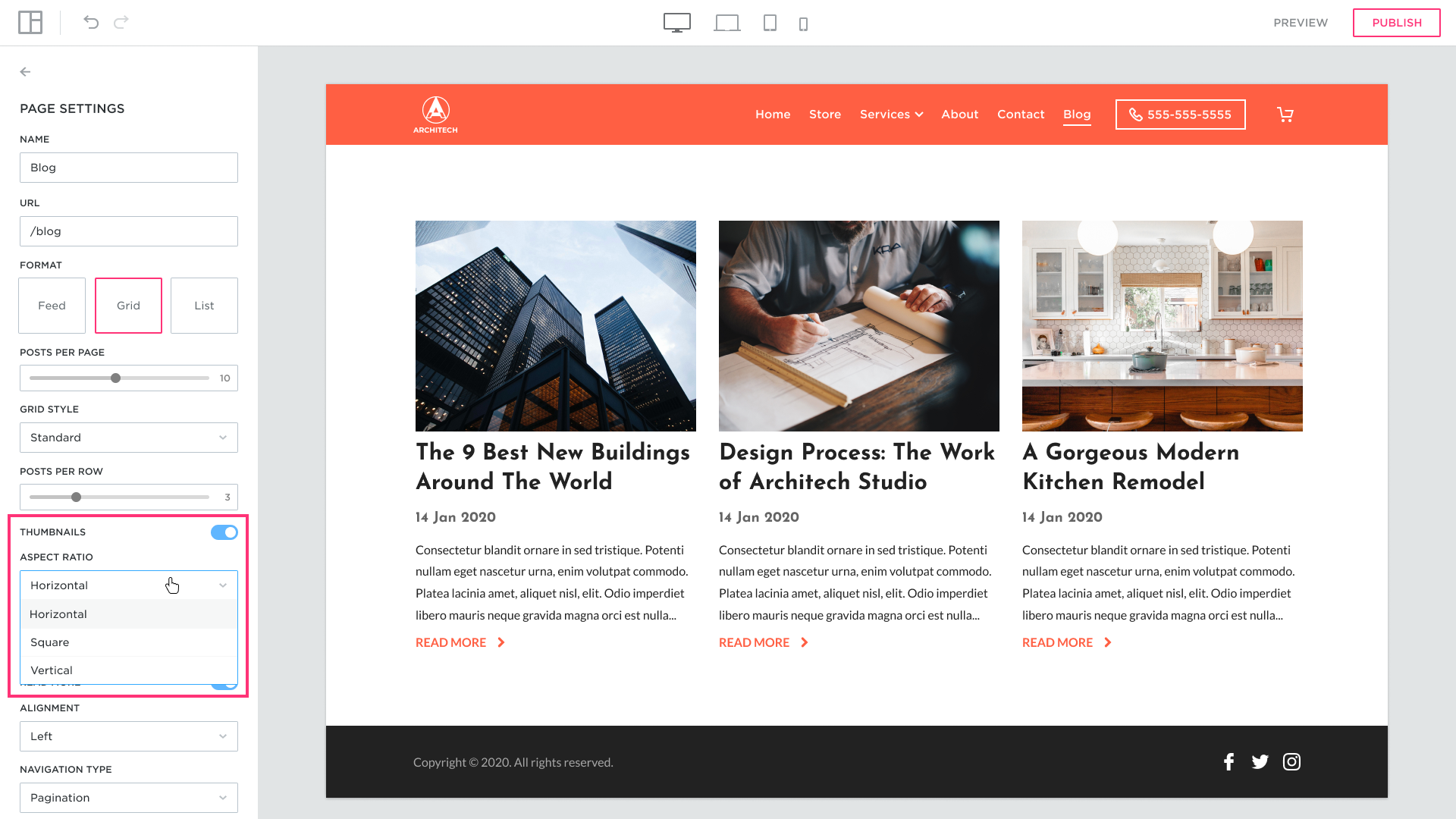 Set the Thumbnail aspect ratio from the dropdown list. Horizontal: