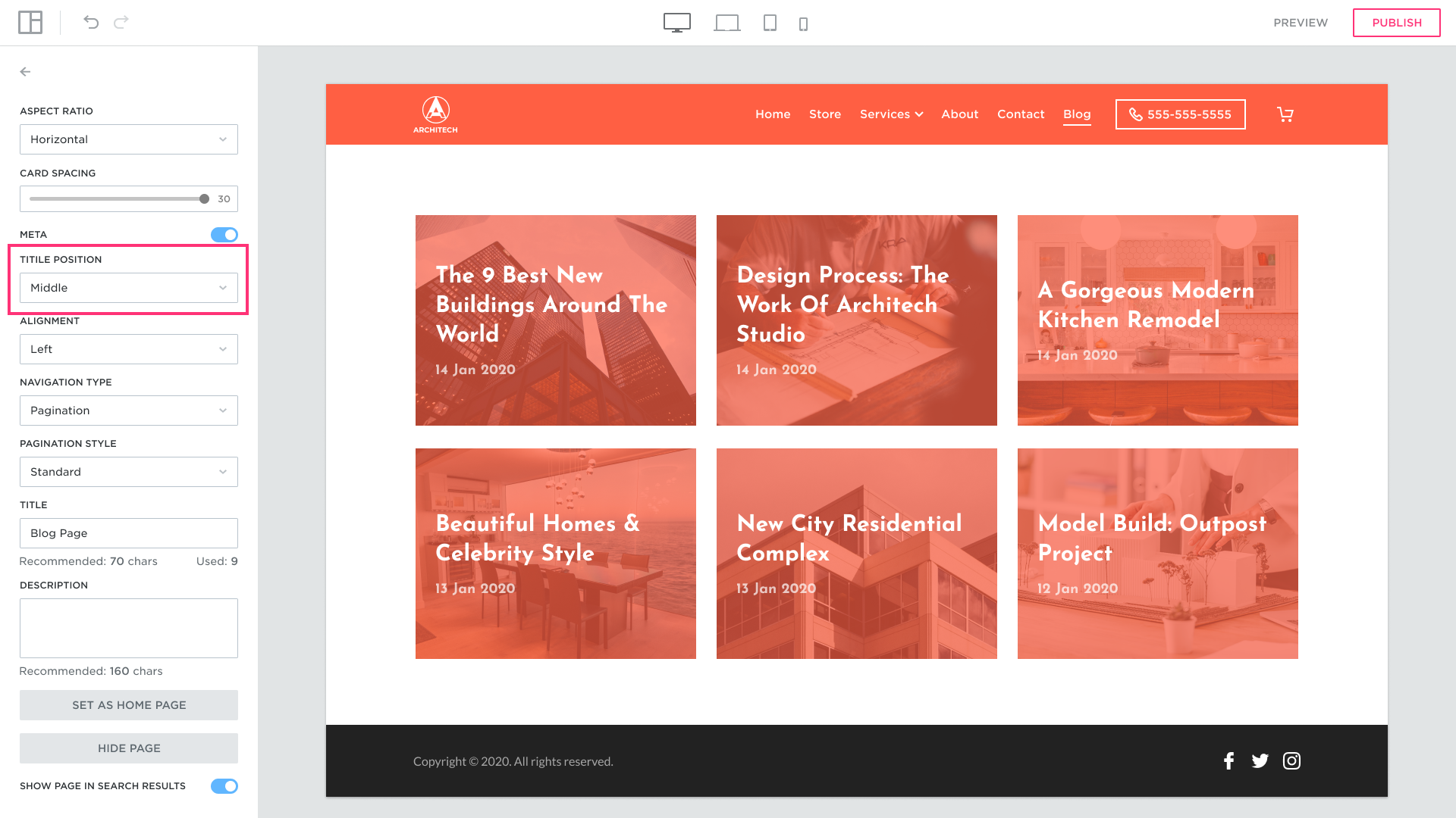 Set the spacing between cards (posts on the page). The spacing is set 30 by default: